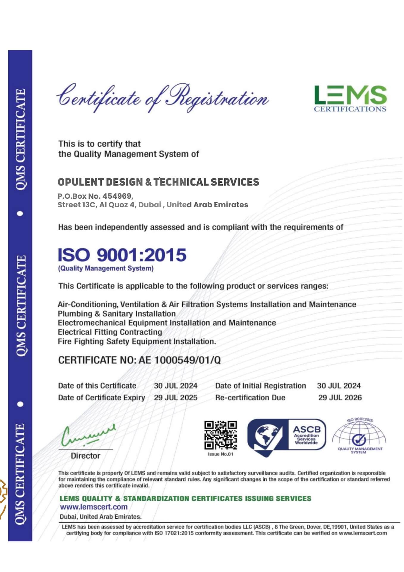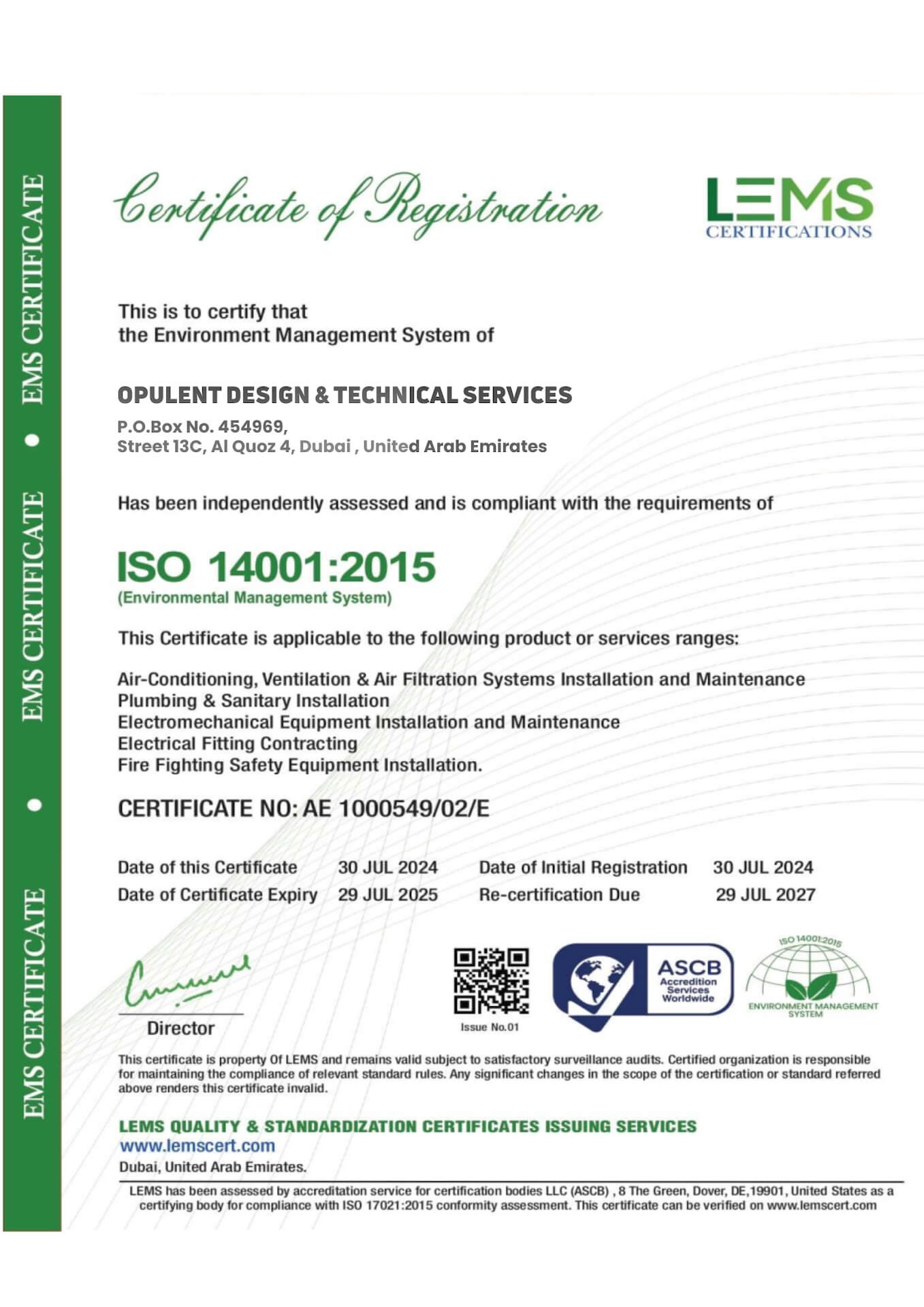 At Opulent Designs, our MEP services are built on precision, innovation, and a steadfast commitment to quality, safety, and environmental responsibility. Fully licensed and proudly certified under Dubai Municipality’s LEMS Quality Management and LEMS Environmental Management standards, we deliver mechanical, electrical, and plumbing solutions that are both compliant and performance-driven.
